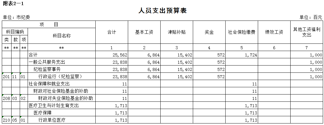 附表2-1 人员支出预算表