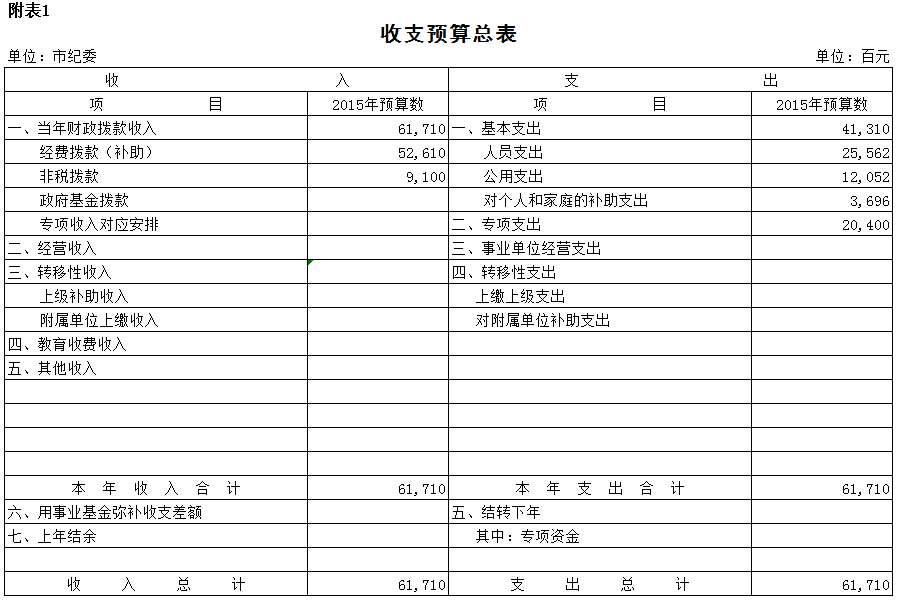2015年市纪委收入预算总额为617.1万元,相应安排支出预算617.1万元,其中:人员支出255.62万元,日常公用支出120.52万元,对个人和家庭的补助支出36.96万元,专项支出204万元。